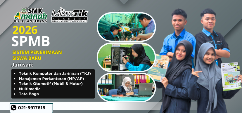 SMK Amanah hadir sebagai sekolah kejuruan yang dirancang selaras dengan kebutuhan dunia kerja, membekali siswa dengan kompetensi nyata dan siap pakai. Melalui jurusan yang relevan dan dibutuhkan industri seperti TKJ (Teknik Komputer dan Jaringan), MP (Manajemen Perkantoran), dan Teknik Otomotif, pembelajaran difokuskan pada praktik, keterampilan, dan problem nyata di lapangan. Didukung pemanfaatan teknologi terkini dalam proses belajar, SMK Amanah menyiapkan lulusan yang adaptif, terampil, dan siap bersaing di era digital